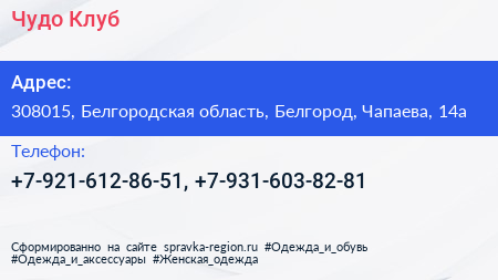 Чудо Клуб по адресу 308015, Белгородская область, Белгород, Чапаева, 14а в дальнейшем Организация, размещена в следующих категориях: