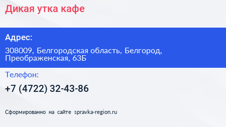 Дикая утка, кафе по адресу 308009, Белгородская область, Белгород, Преображенская, 63Б в дальнейшем Организация, размещена в следующих категориях: