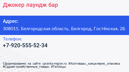Джокер, лаундж-бар по адресу 308015, Белгородская область, Белгород, Гостёнская, 2Б в дальнейшем Организация, размещена в следующих категориях: