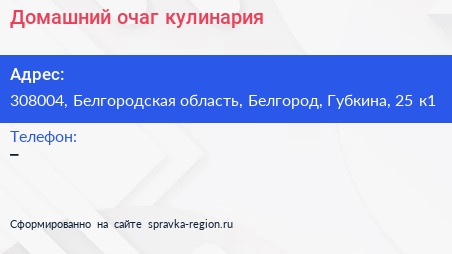 Домашний очаг, кулинария по адресу 308004, Белгородская область, Белгород, Губкина, 25 к1 в дальнейшем Организация, размещена в следующих категориях: