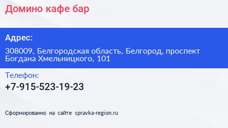 Домино, кафе-бар по адресу 308009, Белгородская область, Белгород, проспект Богдана Хмельницкого, 101 в дальнейшем Организация, размещена в следующих категориях: