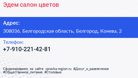 Эдем, салон цветов по адресу 308036, Белгородская область, Белгород, Конева, 2 в дальнейшем Организация, размещена в следующих категориях: