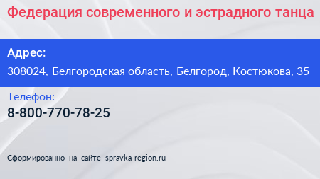Федерация современного и эстрадного танца по адресу 308024, Белгородская область, Белгород, Костюкова, 35 в дальнейшем Организация, размещена в следующих категориях: