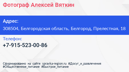 Фотограф Алексей Вяткин по адресу 308504, Белгородская область, Белгород, Прелестная, 18 в дальнейшем Организация, размещена в следующих категориях: