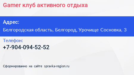 Gamer, клуб активного отдыха по адресу Белгородская область, Белгород, Урочище Сосновка, 3 в дальнейшем Организация, размещена в следующих категориях: