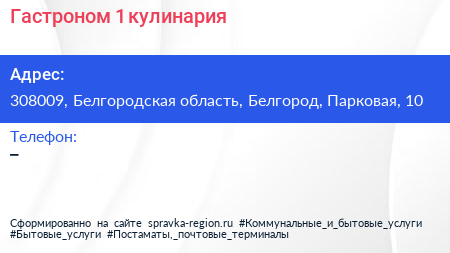 Гастроном №1, кулинария по адресу 308009, Белгородская область, Белгород, Парковая, 10 в дальнейшем Организация, размещена в следующих категориях:
