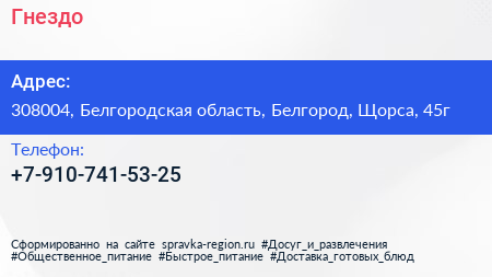 Гнездо по адресу 308004, Белгородская область, Белгород, Щорса, 45г в дальнейшем Организация, размещена в следующих категориях: