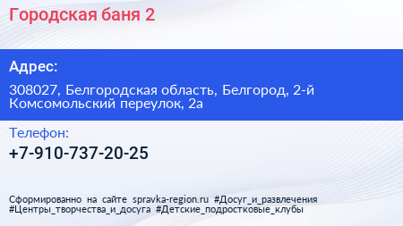 Городская баня №2 по адресу 308027, Белгородская область, Белгород, 2-й Комсомольский переулок, 2а в дальнейшем Организация, размещена в следующих категориях:
