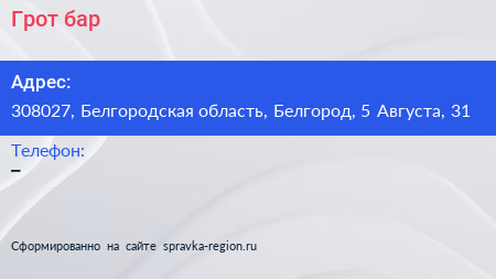 Грот, бар по адресу 308027, Белгородская область, Белгород, 5 Августа, 31 в дальнейшем Организация, размещена в следующих категориях: