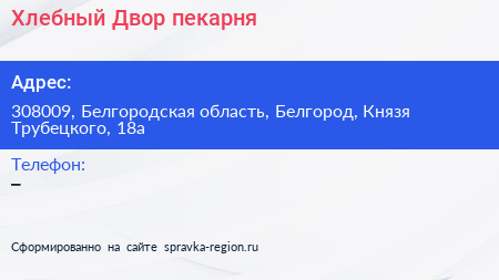 Хлебный Двор, пекарня по адресу 308009, Белгородская область, Белгород, Князя Трубецкого, 18а в дальнейшем Организация, размещена в следующих категориях:
