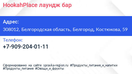 HookahPlace, лаундж-бар по адресу 308012, Белгородская область, Белгород, Костюкова, 59 в дальнейшем Организация, размещена в следующих категориях: