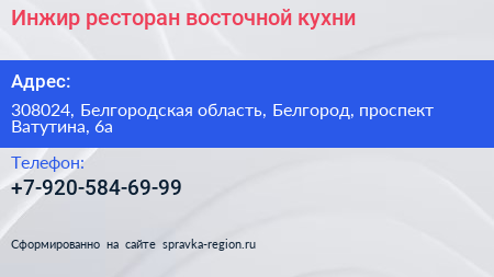 Инжир, ресторан восточной кухни по адресу 308024, Белгородская область, Белгород, проспект Ватутина, 6а в дальнейшем Организация, размещена в следующих категориях: