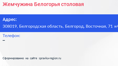 Жемчужина Белогорья, столовая по адресу 308019, Белгородская область, Белгород, Восточная, 71 к4 в дальнейшем Организация, размещена в следующих категориях: