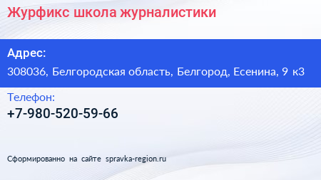 Журфикс, школа журналистики по адресу 308036, Белгородская область, Белгород, Есенина, 9 к3 в дальнейшем Организация, размещена в следующих категориях: