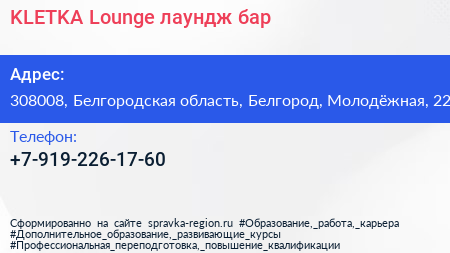KLETKA Lounge, лаундж-бар по адресу 308008, Белгородская область, Белгород, Молодёжная, 22 в дальнейшем Организация, размещена в следующих категориях: