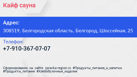 Кайф, сауна по адресу 308519, Белгородская область, Белгород, Шоссейная, 25 в дальнейшем Организация, размещена в следующих категориях: