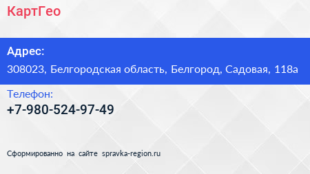 КартГео по адресу 308023, Белгородская область, Белгород, Садовая, 118а в дальнейшем Организация, размещена в следующих категориях: