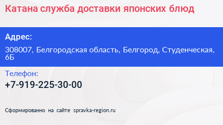 Катана, служба доставки японских блюд по адресу 308007, Белгородская область, Белгород, Студенческая, 6Б в дальнейшем Организация, размещена в следующих категориях:
