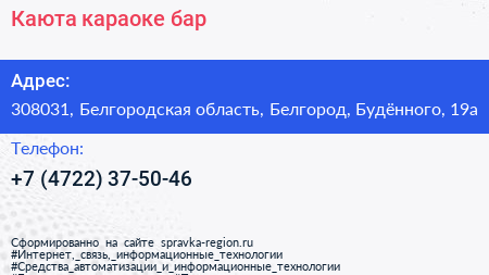Каюта, караоке-бар по адресу 308031, Белгородская область, Белгород, Будённого, 19а в дальнейшем Организация, размещена в следующих категориях: