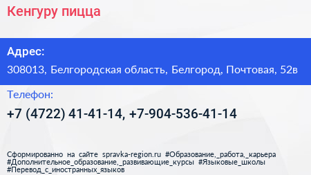 Кенгуру пицца по адресу 308013, Белгородская область, Белгород, Почтовая, 52в в дальнейшем Организация, размещена в следующих категориях: