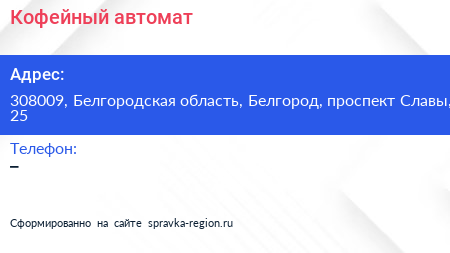 Кофейный автомат по адресу 308009, Белгородская область, Белгород, проспект Славы, 25 в дальнейшем Организация, размещена в следующих категориях: