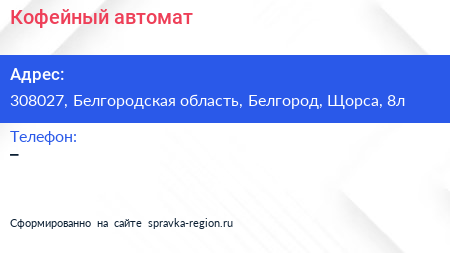 Кофейный автомат по адресу 308027, Белгородская область, Белгород, Щорса, 8л в дальнейшем Организация, размещена в следующих категориях: