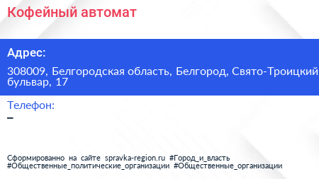 Кофейный автомат по адресу 308009, Белгородская область, Белгород, Свято-Троицкий бульвар, 17 в дальнейшем Организация, размещена в следующих категориях: