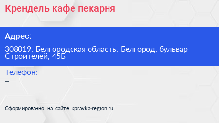 Крендель, кафе-пекарня по адресу 308019, Белгородская область, Белгород, бульвар Строителей, 45Б в дальнейшем Организация, размещена в следующих категориях: