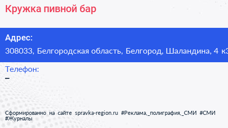 Кружка, пивной бар по адресу 308033, Белгородская область, Белгород, Шаландина, 4 к3 в дальнейшем Организация, размещена в следующих категориях: