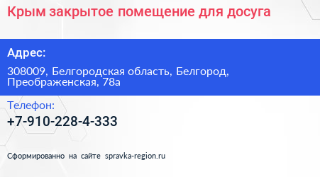 Крым, закрытое помещение для досуга по адресу 308009, Белгородская область, Белгород, Преображенская, 78а в дальнейшем Организация, размещена в следующих категориях: