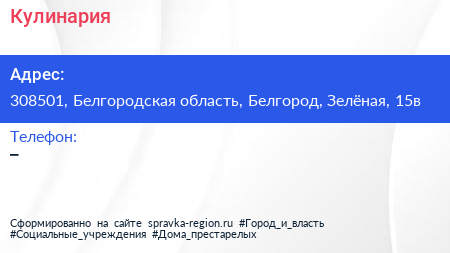 Кулинария по адресу 308501, Белгородская область, Белгород, Зелёная, 15в в дальнейшем Организация, размещена в следующих категориях: