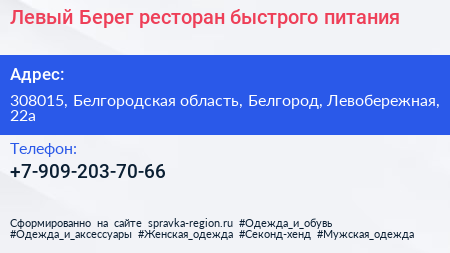 Левый Берег, ресторан быстрого питания по адресу 308015, Белгородская область, Белгород, Левобережная, 22а в дальнейшем Организация, размещена в следующих категориях: