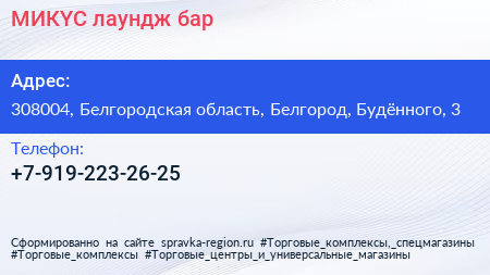 МИКYС, лаундж-бар по адресу 308004, Белгородская область, Белгород, Будённого, 3 в дальнейшем Организация, размещена в следующих категориях: