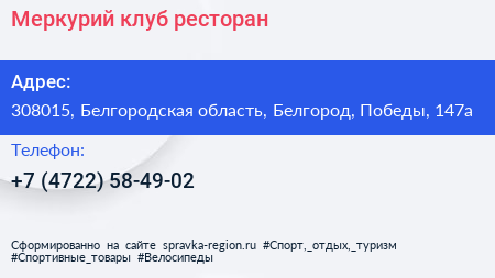 Меркурий-клуб, ресторан по адресу 308015, Белгородская область, Белгород, Победы, 147а в дальнейшем Организация, размещена в следующих категориях: