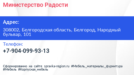 Министерство Радости по адресу 308002, Белгородская область, Белгород, Народный бульвар, 101 в дальнейшем Организация, размещена в следующих категориях: