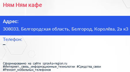 Ням Ням, кафе по адресу 308033, Белгородская область, Белгород, Королёва, 2а к3 в дальнейшем Организация, размещена в следующих категориях: