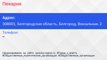 Пекарня по адресу 308001, Белгородская область, Белгород, Вокзальная, 2 в дальнейшем Организация, размещена в следующих категориях: