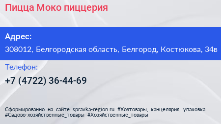 Пицца Моко, пиццерия по адресу 308012, Белгородская область, Белгород, Костюкова, 34в в дальнейшем Организация, размещена в следующих категориях: