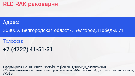 RED RAK, раковарня по адресу 308009, Белгородская область, Белгород, Победы, 71 в дальнейшем Организация, размещена в следующих категориях: