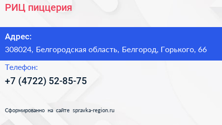 РИЦ, пиццерия по адресу 308024, Белгородская область, Белгород, Горького, 66 в дальнейшем Организация, размещена в следующих категориях: