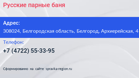 Русские парные, баня по адресу 308024, Белгородская область, Белгород, Архиерейская, 4 в дальнейшем Организация, размещена в следующих категориях: