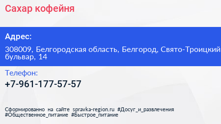 Сахар, кофейня по адресу 308009, Белгородская область, Белгород, Свято-Троицкий бульвар, 14 в дальнейшем Организация, размещена в следующих категориях: