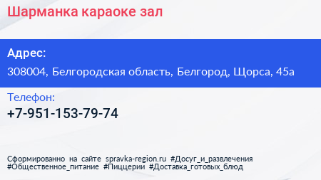 Шарманка, караоке-зал по адресу 308004, Белгородская область, Белгород, Щорса, 45а в дальнейшем Организация, размещена в следующих категориях: