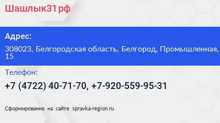 Шашлык31.рф по адресу 308023, Белгородская область, Белгород, Промышленная, 15 в дальнейшем Организация, размещена в следующих категориях: