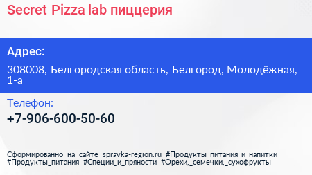 Secret Pizza lab, пиццерия по адресу 308008, Белгородская область, Белгород, Молодёжная, 1-а в дальнейшем Организация, размещена в следующих категориях: