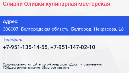 Сливки Оливки, кулинарная мастерская по адресу 308007, Белгородская область, Белгород, Некрасова, 16 в дальнейшем Организация, размещена в следующих категориях: