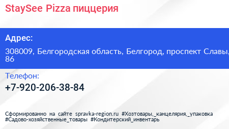 StaySee Pizza, пиццерия по адресу 308009, Белгородская область, Белгород, проспект Славы, 86 в дальнейшем Организация, размещена в следующих категориях: