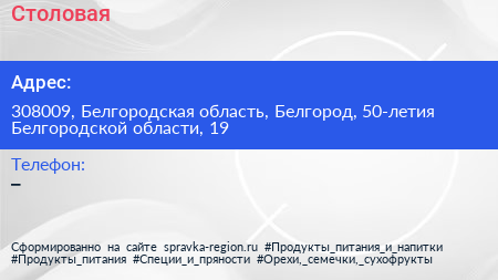 Столовая по адресу 308009, Белгородская область, Белгород, 50-летия Белгородской области, 19 в дальнейшем Организация, размещена в следующих категориях: