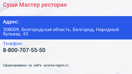 Суши Мастер, ресторан по адресу 308009, Белгородская область, Белгород, Народный бульвар, 43 в дальнейшем Организация, размещена в следующих категориях: