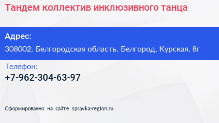 Тандем, коллектив инклюзивного танца по адресу 308002, Белгородская область, Белгород, Курская, 8г в дальнейшем Организация, размещена в следующих категориях: